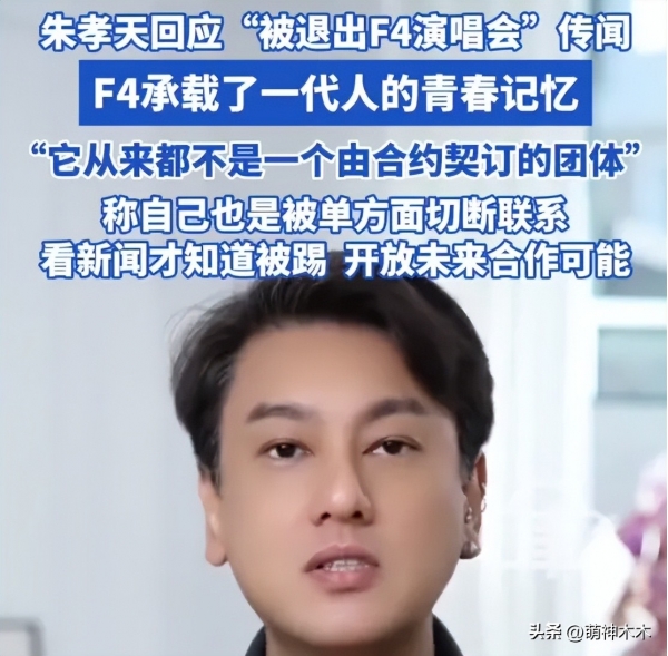 朱孝天缺席F4演唱会一事闹得沸沸扬扬,他自曝因为拒绝相信音乐的要求而被踢出局,还爆料相信音乐的要求太没良心,就算以后F4再合体,也不会和相信音乐合作,还疑似和其他三人观念不和。