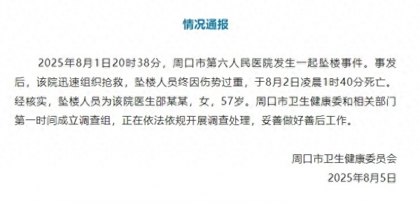 经核实,坠楼人员为该院医生邵某某,女,57岁。周口市卫生健康委和相关部门第一时间成立调查组,正在依法依规开展调查处理,妥善做好善后工作。