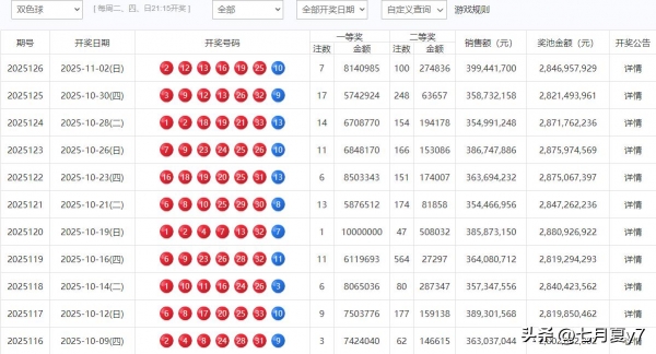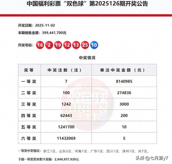 11月3日,双色球第2025126期开奖:红球02、12、13、16、19、25,蓝球10。销量3.99亿元,奖池升至28.47亿元,返奖率27.1%。