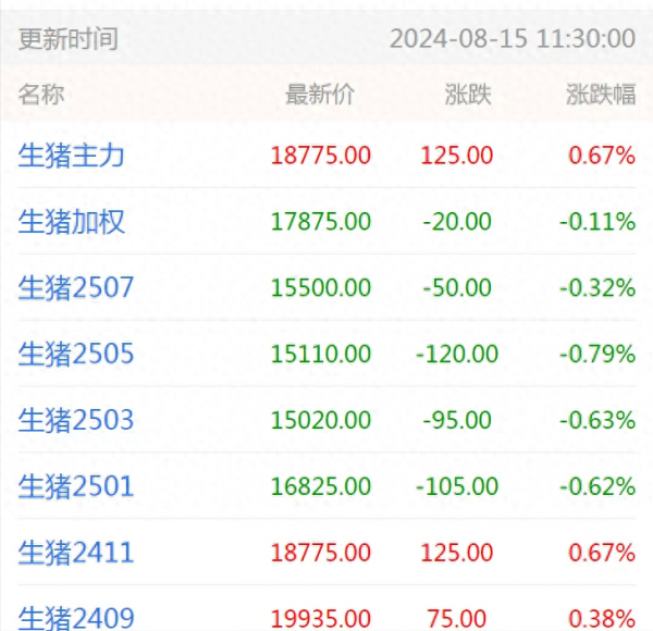 近期,由于现货生猪报价连创新高,市场对于生猪合约报价延续"近强远弱"的预判,从最新反馈了解,截止8月15日午盘,国内生猪合约方面,主力2409合约上涨75元,涨至19935元/吨;生猪2411合约上涨125元,涨至18775元/吨;2501合约下跌105元,跌至16825元/吨;2503合约下跌95元,报价15020元/吨;2505合约下跌120元,跌至15110元/吨……