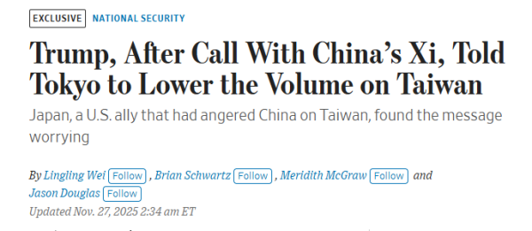据《华尔街日报》报道,特朗普曾电话警告高市早苗不要在台湾问题上挑衅