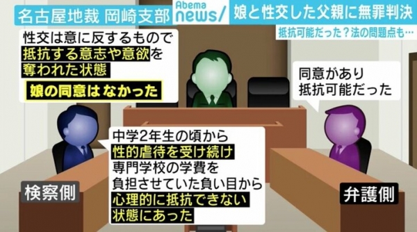 而辩护方则认为,被告父亲就性交一事取得了女儿的同意,并且女儿处于可以抵抗的状态,所以要求法院判处无罪。