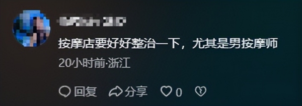 还有网友直言这种按摩店就应该好好整治一下了,尤其是哪些男按摩师们,鱼龙混杂的太严重了,严重扰乱了行业生态的发展。
