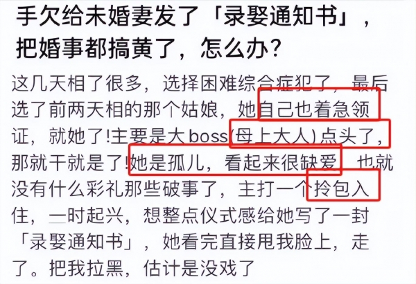 怪不得男子会在某平台发文求助:手欠给未婚妻发了"录娶通知书",把婚事都搞黄了,怎么办?