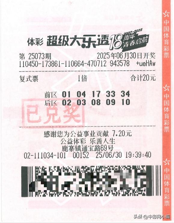喜讯! 6月30日开奖的超级大乐透第25073期,广西柳州鹿寨一位幸运购彩者王先生(化姓)凭借一张20元复式票,成功揽获812万余元大奖!
