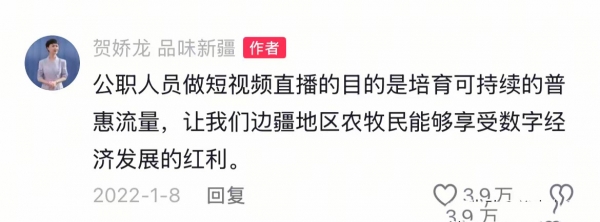 虽然后期不少网友对她的"网红"路线存在质疑,贺娇龙也给出回复,表示公职人员做短视频直播的目的就是培养和持续的普惠流量,让边疆地区的农牧民可以享受数字经济发展红利。