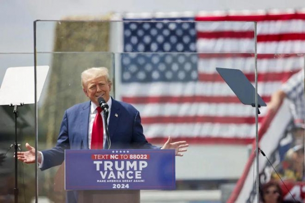 当地时间2024年8月21日,美国北卡罗来纳州,美国前总统特朗普与竞选搭档万斯在户外举行竞选集会,讲台上加装防弹玻璃保护 图:IC