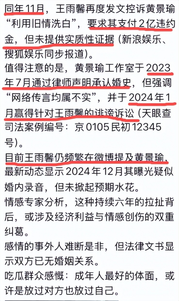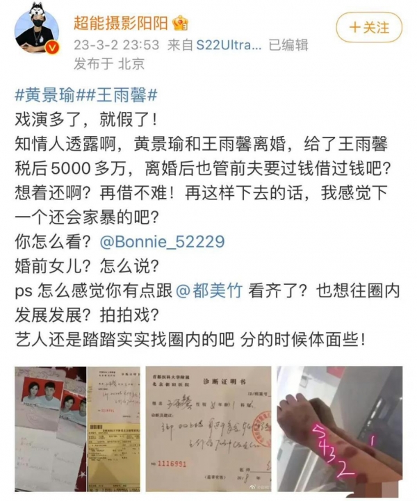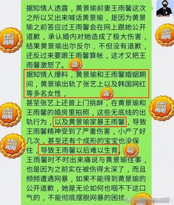 但一年后,又出现了一名爆料人,更是曝光了黄景瑜和王雨馨婚内的一些细节,还声称黄景瑜和多名艺人有不正当关系。