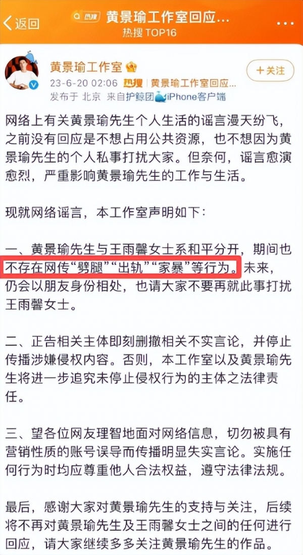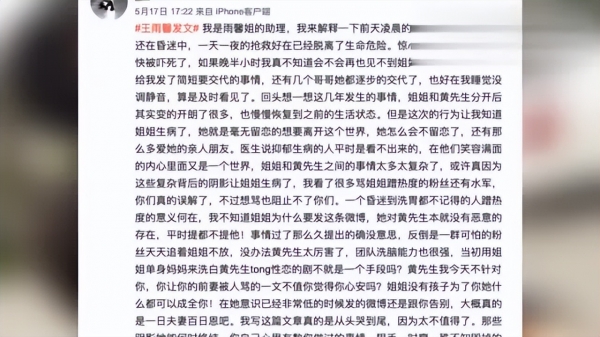 两年后,旧事重提,这次是一位自称王雨馨助理的人爆料,黄景瑜在婚内多次出轨、家暴,甚至还导致女方流产。