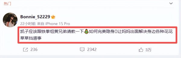 "凯子应该跟铁拳组合黄兄弟请教一下,如何完美隐身,让妈妈出面解决身边各种花花草草挡道事"。