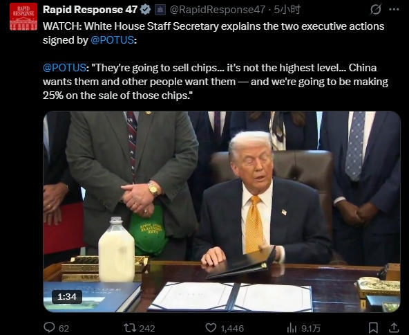 "这些芯片不是最高水平,但非常好,"特朗普当天在签署仪式上对记者声称,"中国想要它们,其他人也想要,我们将从这些芯片销售中获得25%的收入,事儿就是这么回事儿。"