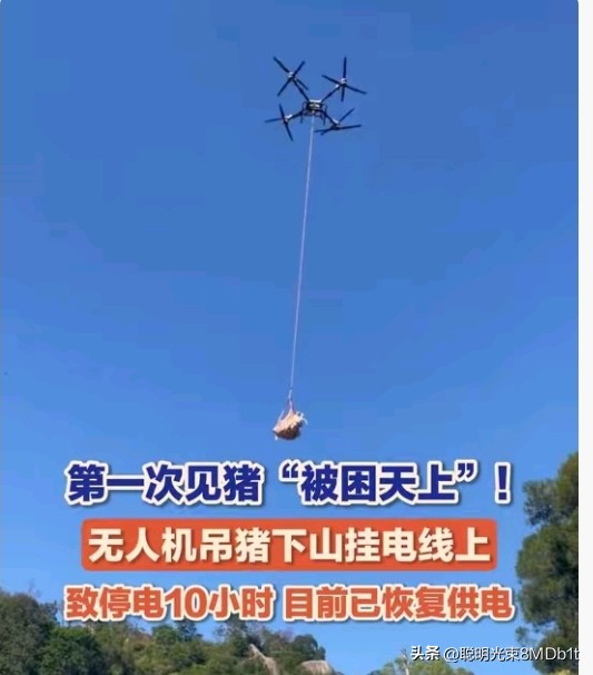 一头猪坐无人机"空运"下山,结果挂电线上把全村电都给掐了?1月24日凌晨,四川巴中真就出了这么档子事。