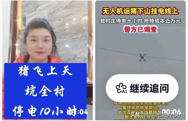 大半夜天黑得伸手不见五指,有人想用无人机把十几头猪吊运下山杀年猪。第一头猪刚升空就"卡了壳",稳稳挂在电线上动弹不得。大家忙活半天想把这"飞天猪"救下来,折腾来折腾去也没辙。结果呢?整村被迫停电10小时,最后还是靠抢修才通上电。有人说这技术没练好就敢上,也有人觉得夜间作业视线差是硬伤。不管咋样,想省点力气,结果把大家伙都坑了。