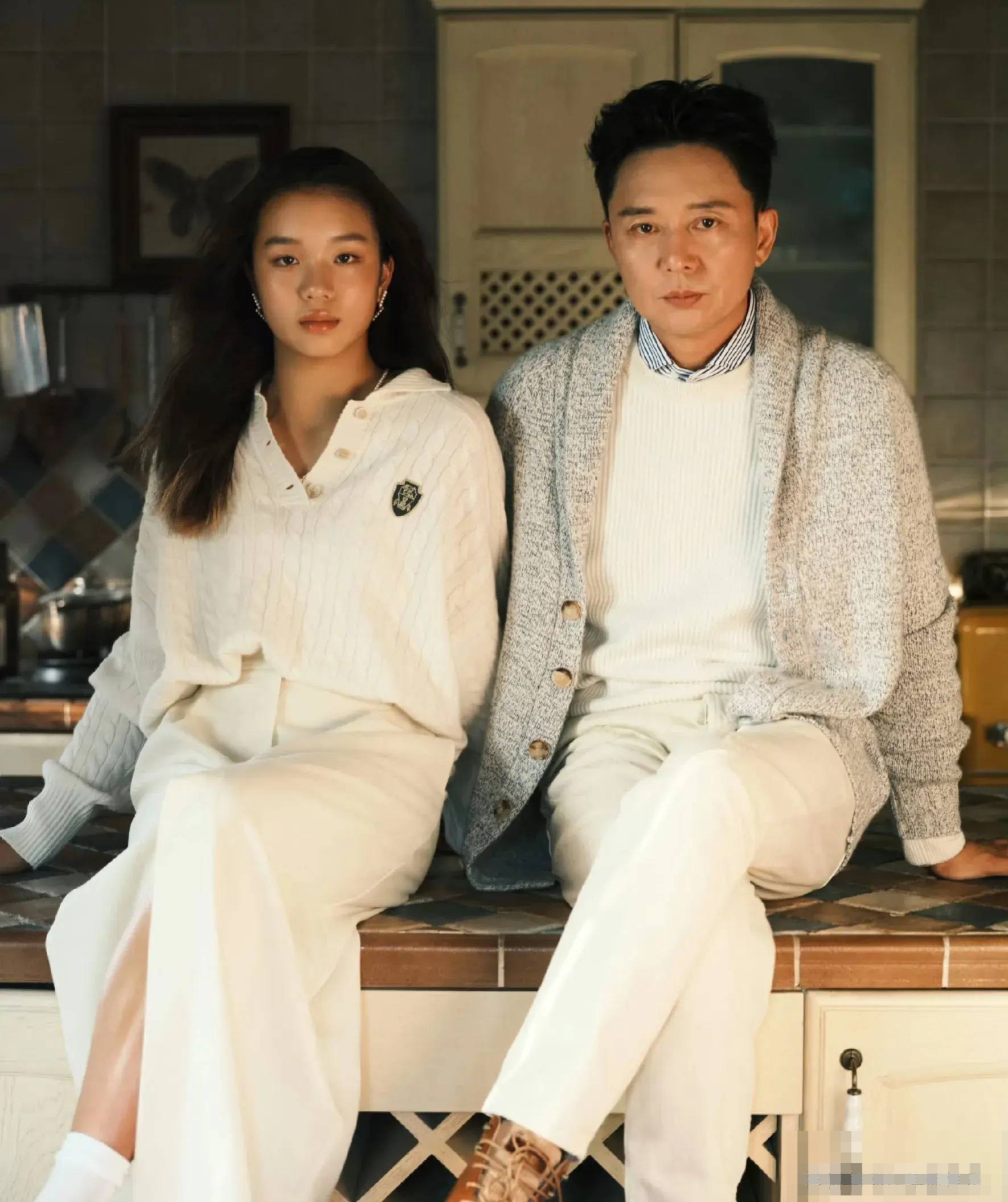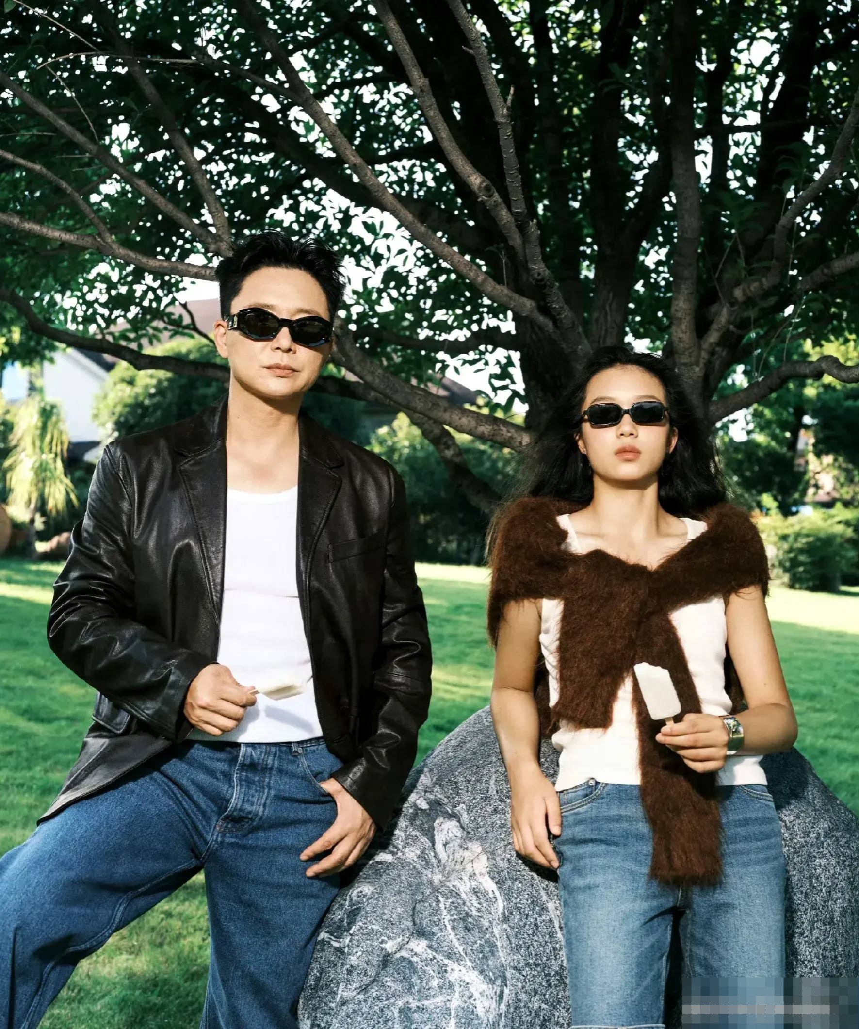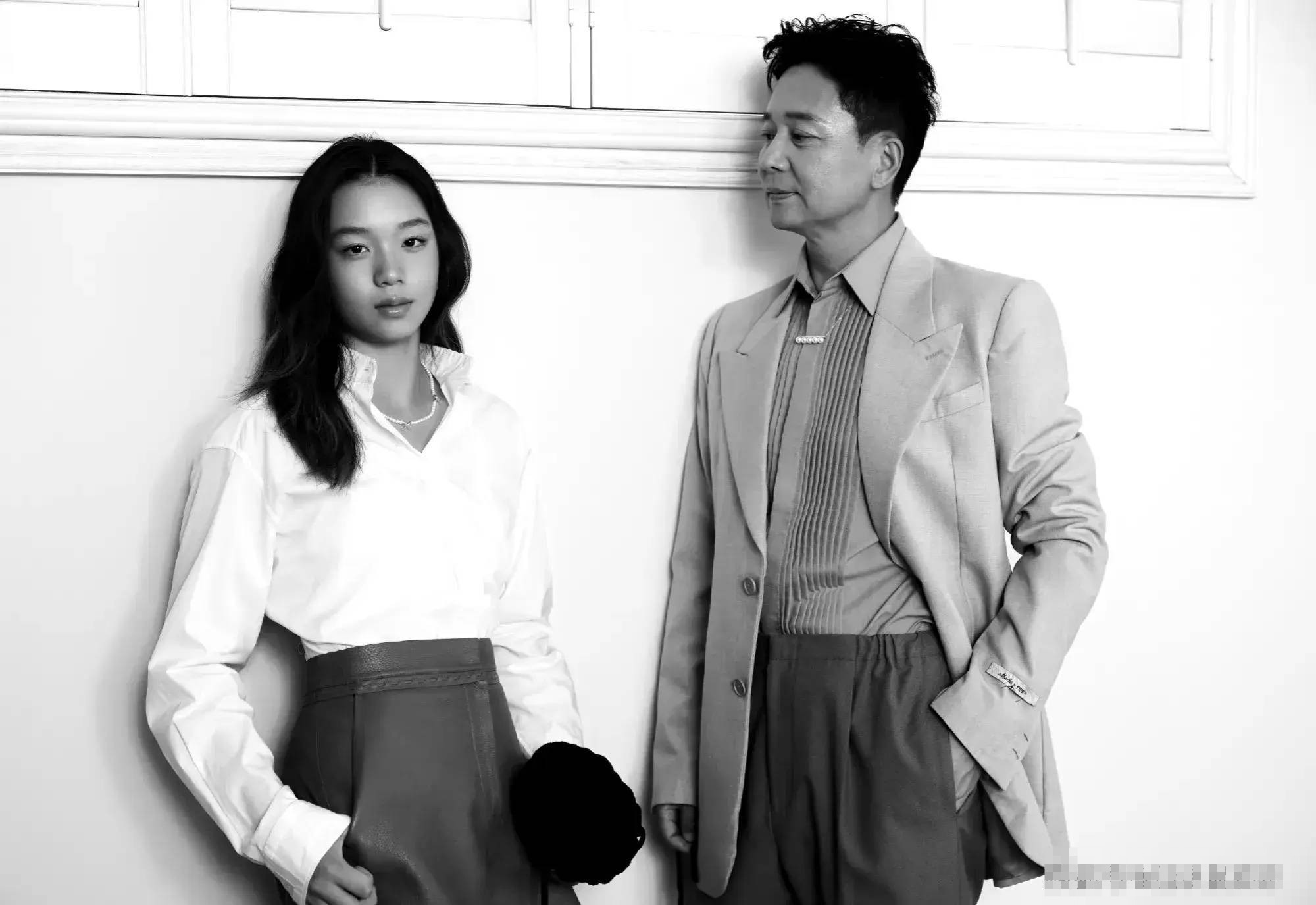 刘奕君与女儿刘悦淇并排坐在一起,一起看向镜头的样子,酷感十足,父女俩不苟言笑,一本正经,满满的出片感。