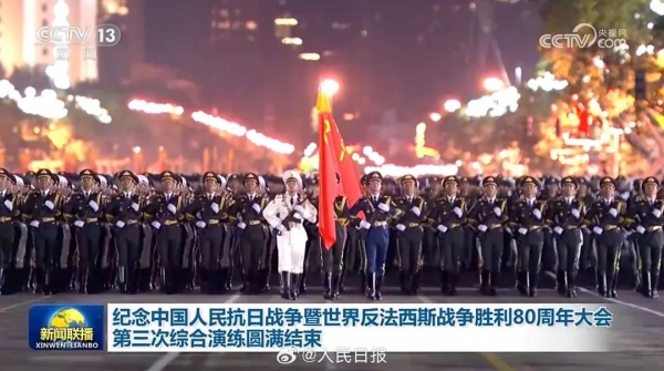 记者从中国人民抗日战争暨世界反法西斯战争胜利80周年纪念活动新闻中心获悉,8月23日17时至8月24日5时,北京天安门地区举行了纪念中国人民抗日战争暨世界反法西斯战争胜利80周年大会第三次综合演练。