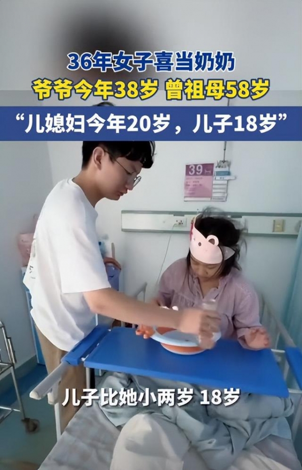 36岁女子喜当奶奶,爷爷今年38岁,曾祖母58岁,"儿媳妇今年20岁,儿子18岁"。