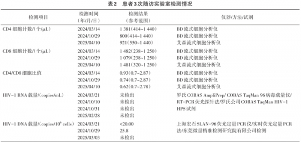 从2024年3月到2025年4月,患者共进行了三次随访,在这三次随访中,他的CD4和CD8细胞计数均未见异常,而HIV-RNA始终保持未检出。在HIV-DNA方面,第一次结果低于检出限,第二次结果略高于检出限(25.8 copies/10^6 cells),但仍属于极低水平,第三次结果则再次未检出。