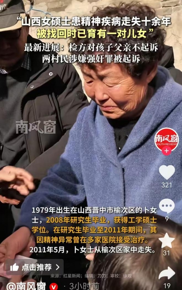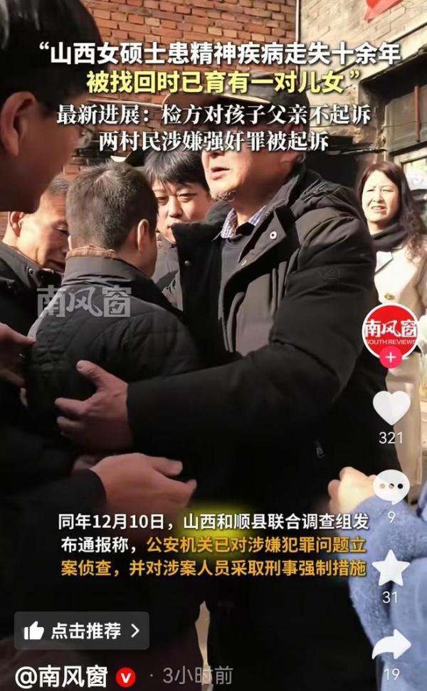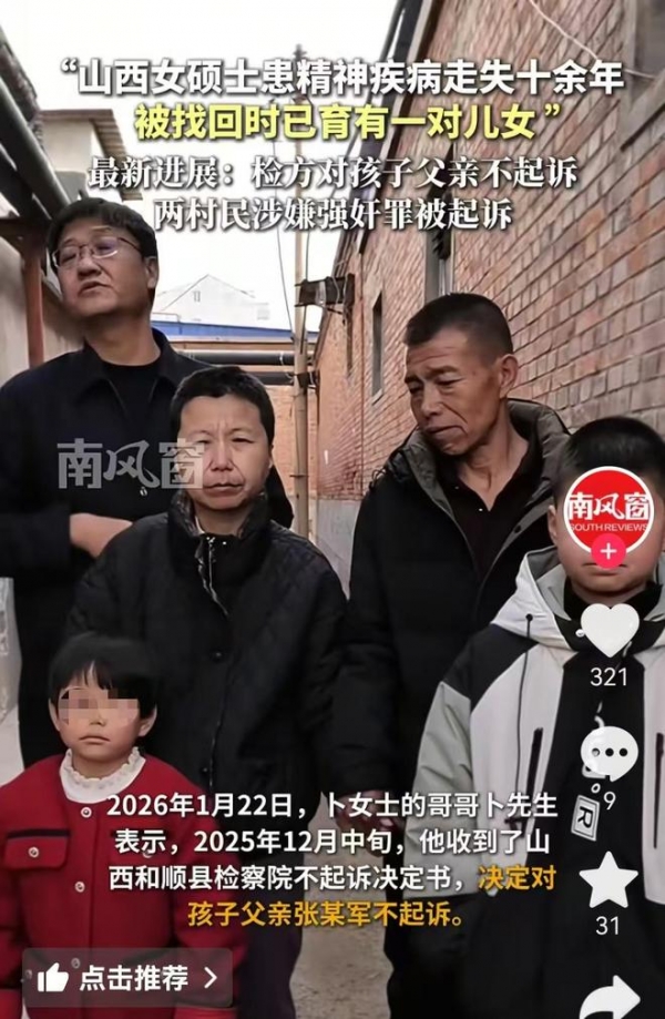 1月23日,记者从山西和顺县联合调查组获悉,女硕士失踪13年生育2个孩子案件的新进展来了,检察院决定对孩子的父亲张某,不予起诉。