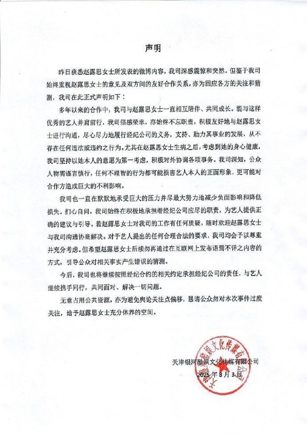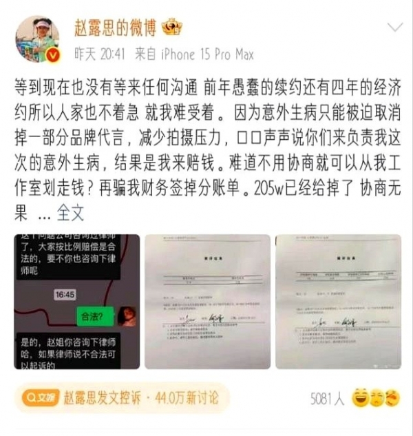 8月3日,赵露思公开起诉银河酷娱传媒,指控公司在她抑郁症发作、被迫停工期间,不仅违约划走她工作室205万补偿款,还拿家人和封杀威胁她。