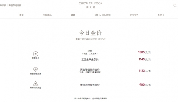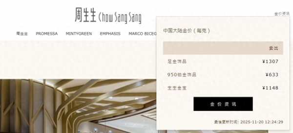 中新经纬11月20日电 国内品牌金饰价格多日下调后,11月20日,多家黄金珠宝品牌公布的境内足金首饰价格较昨日有所上调,周生生、老庙黄金等品牌金饰克价再度涨回1300元。