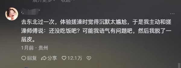 一位贵州的网友评论说:之前去过东北一次,体验搓澡的时候觉得沉默的氛围有些尴尬,便想着主动破冰,随后就开口跟搓澡大姨唠起了家常。