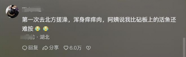湖北的网友回忆起第一次去北方搓澡的场景,往那一趟感觉浑身都刺挠,哪里都是痒痒肉,结果搓澡的大姨说:"真是比砧板上的活鱼还难按。"