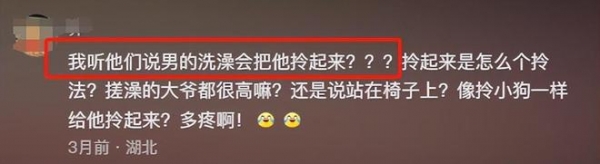 一位湖北网友好奇的提问:我听说他们男的洗澡会把他拎起来???怎么个拎法?搓澡的大爷都很高吗?还是说站在椅子上,像拎小狗一样给他拎起来,被人揪住命运的后颈那得多疼!