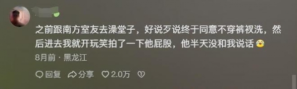 东北网友:之前跟南方室友去澡堂子,好说歹说终于同意不穿裤衩洗,然后我进去开玩笑拍了一下他屁股,他半天没和我说话。