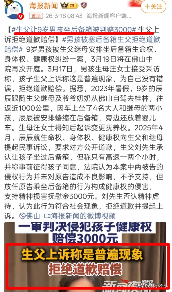 生母告诉记者,目前一审审判的结果出来了,法院认为本案中两被告的侵权行为并未对原告造成不良影响,不予支持,但放任原告乘坐后备箱的行为构成健康权的侵害,支持精神损害抚慰金3000元。