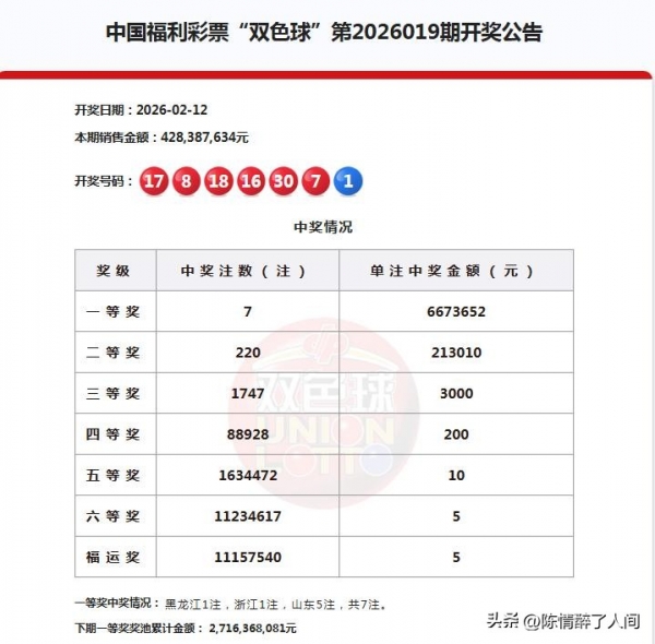 大家好!今天是2026年2月12日,周二,今晚双色球26018开奖,在上期双色球开出6 注一等奖后,本期双色球奖池滚存为27.8亿。本期开奖号码:红球:7、8、16、17、18、30蓝球:1。后区开出了1个1路奇数1号,蓝球振幅6点。