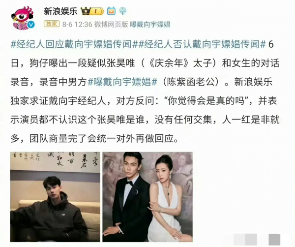 对此,新浪娱乐前往求证经纪人,结果对方反问:"你觉得是真的吗?"还表示戴向宇根本就不认识张昊唯,两个人没有任何交集。