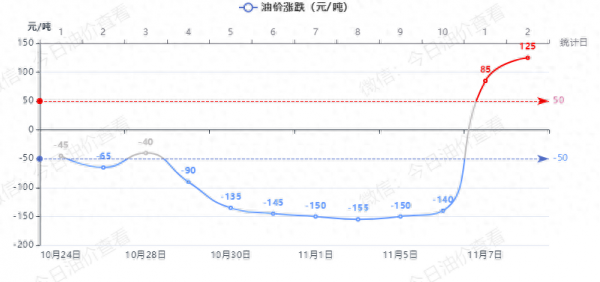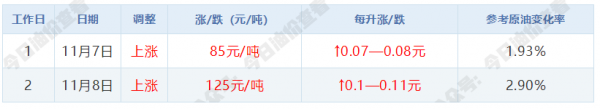 【油价预测】11月9日,本轮国内油价计价统计周期已过去2个工作日,参考原油变化率为2.90%,预计汽柴油上调125元/吨,折算为每升油价上涨0.10-0.11元。油价调整时间:2024年11月20日24时!