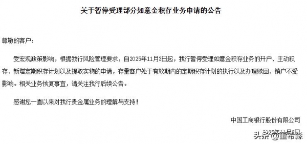 2025年11月3日,工商银行与建设银行相继发布公告,宣布暂停旗下如意金积存、易存金业务的新增开户、主动积存及实物提取等服务。不过,3日傍晚,工行再次公告称,现已恢复受理如意金积存相关业务办理。