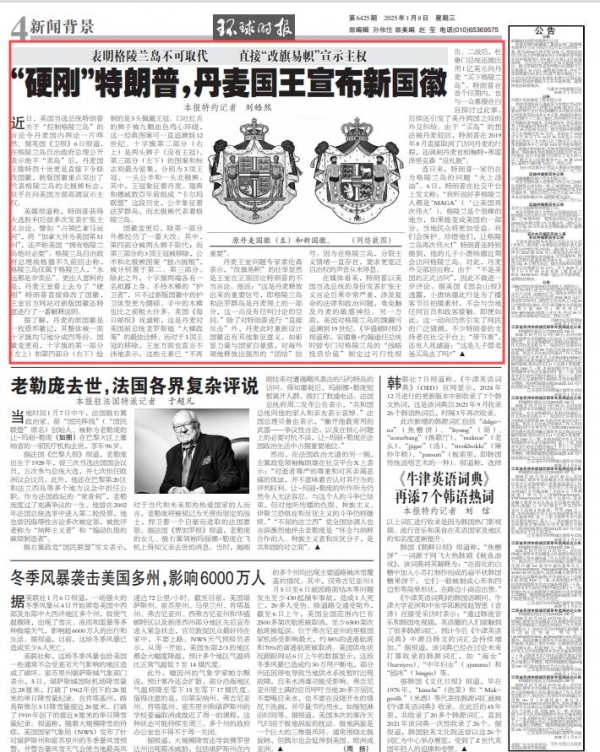 美媒报道称,特朗普获得大选胜利后曾多次发表扩张主义言论,譬如"占领巴拿马运河",将"加拿大并为美国第51州",还声称美国"拥有格陵兰岛绝对必要"。格陵兰岛自治政府总理埃格德不久前回击称,格陵兰岛仅属于格陵兰人,"永远都是非卖品"。更出人意料的是,丹麦王室看上去为了"硬刚"特朗普直接修改了国徽,王室官方网站对新版国徽还特意进行了一番解释说明。