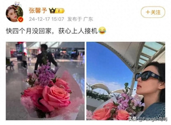 张馨予前段时间在西藏拍戏,几天前发了一个甜蜜的微博,"快四个月没回家,获心上人接机"。