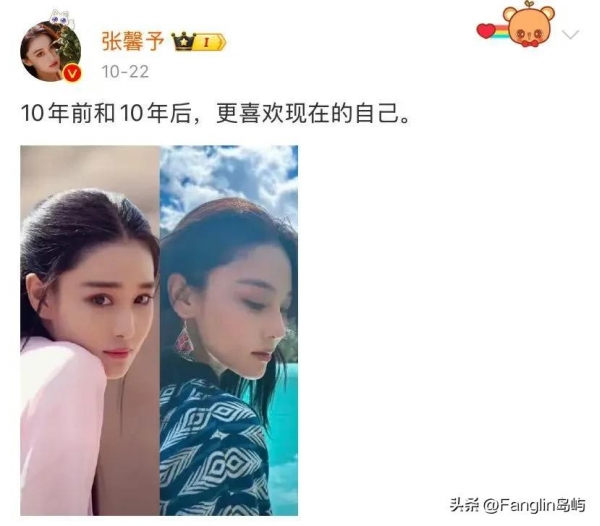 张馨予前不久发了一张自己的对比照,说,"我更喜欢10年后的自己"。