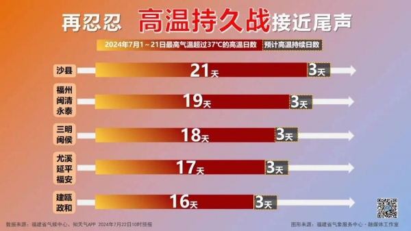 今天至24日,我省大部县市城区最高气温在35℃以上,其中,今天南平和三明两市的大部、福州中西部、龙岩北部城区37~39℃局部可达40℃,宁德中部、莆田北部、泉州中西部和漳州中北部的局部城区 37~38℃。23~24日,南平、三明、龙岩、厦门和泉州五市大部,福州中西部、漳州和莆田两市中北部及宁德南部城区37~39℃,局部可达40℃。