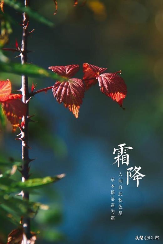 "霜降节时秋已深,寒凝玉露草枯根"。随着10月中旬的到来,霜降节气也就不远了。霜降,是二十四节气之一,也是秋季的最后一个节气,交节于每年公历10月23日或24日,太阳位于黄经210°时,标志着天气渐冷,开始有霜。