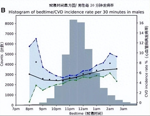 然后,研究人员对他们进行了平均时长为 5.7 年的随访,发现有 3172 名(3.58%)被试患上了心血管疾病,包括:心肌梗塞、心力衰竭、慢性缺血性心脏病、中风和短暂性脑缺血发作。这些心血管疾病患者当中,有 43%在凌晨及更晚睡,38%在晚 11~12 点间睡,而仅有 15%在晚 10~11 点间睡,4%在晚 10 点前睡。