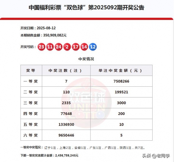 2025年8月12日晚,福彩双色球第25092期开奖。开奖前奖池资金达24.4亿余元,本期销售额3.5亿余元,众多彩民翘首以盼。