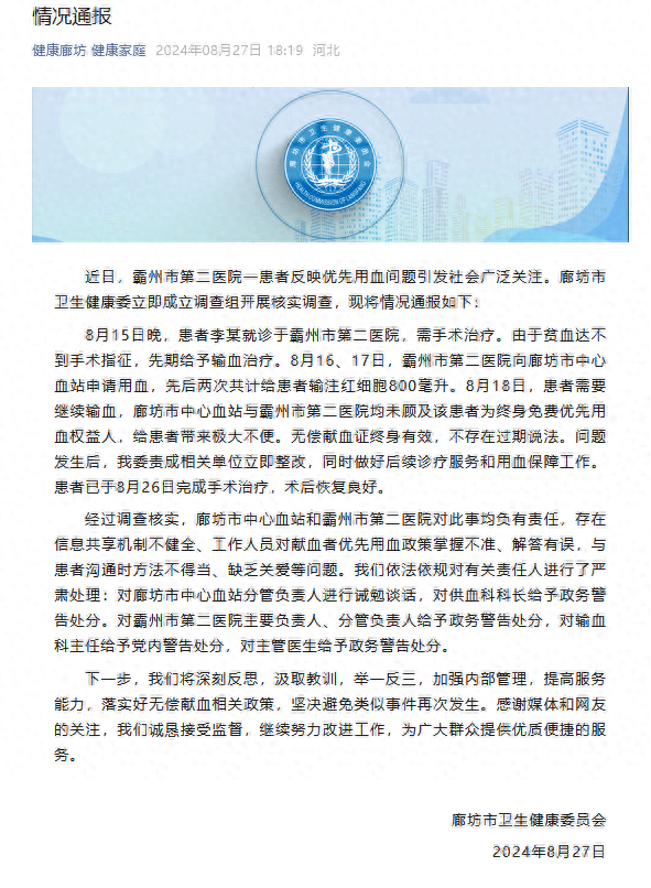 经过调查核实,廊坊市中心血站和霸州市第二医院对此事均负有责任,存在信息共享机制不健全、工作人员对献血者优先用血政策掌握不准、解答有误,与患者沟通时方法不得当、缺乏关爱等问题。我们依法依规对有关责任人进行了严肃处理:对廊坊市中心血站分管负责人进行诫勉谈话,对供血科科长给予政务警告处分。对霸州市第二医院主要负责人、分管负责人给予政务警告处分,对输血科主任给予党内警告处分,对主管医生给予政务警告处分。