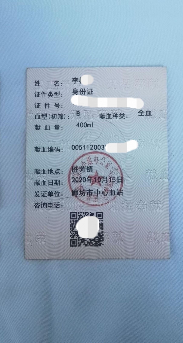 8月15日晚,患者李某就诊于霸州市第二医院,需手术治疗。由于贫血达不到手术指征,先期给予输血治疗。8月16、17日,霸州市第二医院向廊坊市中心血站申请用血,先后两次共计给患者输注红细胞800毫升。8月18日,患者需要继续输血,廊坊市中心血站与霸州市第二医院均未顾及该患者为终身免费优先用血权益人,给患者带来极大不便。无偿献血证终身有效,不存在过期说法。问题发生后,我委责成相关单位立即整改,同时做好后续诊疗服务和用血保障工作。患者已于8月26日完成手术治疗,术后恢复良好。