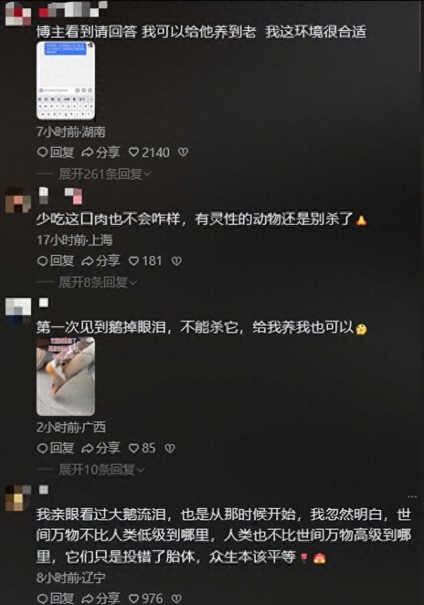 中国农大的董玉兰教授后来指出,鹅的泪腺天生比人发达,哈德氏腺也比较大,这是水禽适应环境的生理结构,鹅流泪不是因为难过,就像人被风沙吹了会流眼泪一样,属于反射动作,扫帚戳到眼睛、强光照射、风吹、甚至倒挂捆绑,都可能让它们分泌泪液,鸡鸭也会有这种情况,只是鹅的眼泪更黏稠,看起来明显一些。