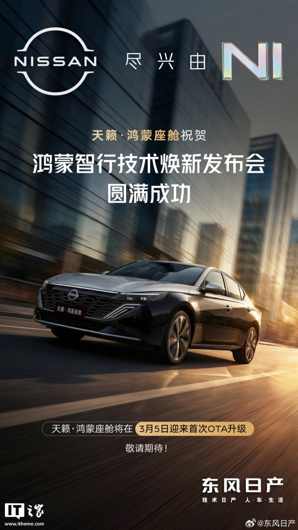 东风日产今日发文,祝贺鸿蒙智行技术焕新发布会圆满成功。官方表示,全球首个鸿蒙座舱燃油车 -- 天籁 · 鸿蒙座舱也将在 3 月 5 日迎来首次 OTA 升级。