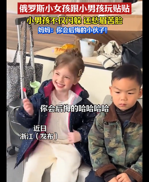 近日,浙江(发布),视频中,一俄罗斯小女孩跟小男孩玩贴贴,小男孩不仅闪躲还愁眉苦脸。