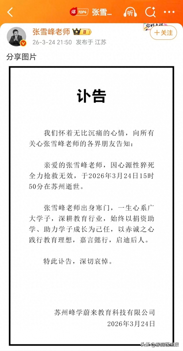 3月24日,苏州峰学蔚来教育科技有限公司发布讣告称,张雪峰因突发疾病,经抢救无效不幸去世。
