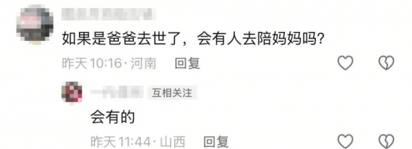 代先生的视频引发网友关注,有网友表示,"这个年龄还有爸爸妈妈多好",也有网友表示,"奶奶心思好细腻",还有网友评论,"如果是爸爸去世了,会有人去陪妈妈吗?"代先生回复,"会有的"。