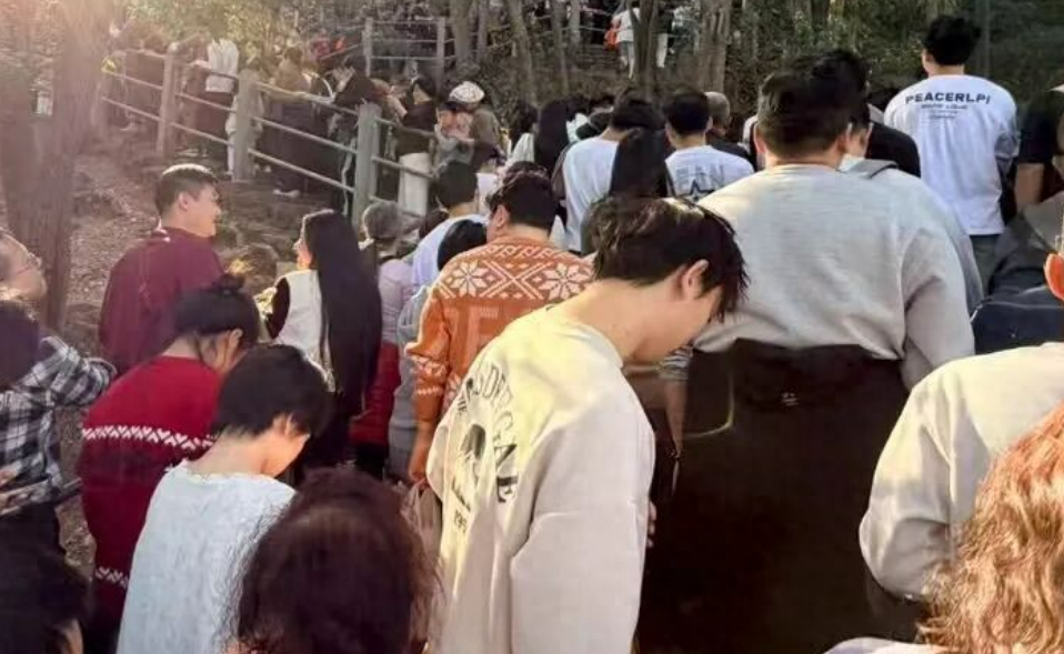 大批游客连夜往山上冲,就为了抢正月初五的头香,登山步道堵得水泄不通,山顶更是人挤人,连下脚的地方都快没了。夜色里,山道上游客的手机灯光连成一条蜿蜒长龙,从山脚一直延伸到山顶寺庙。