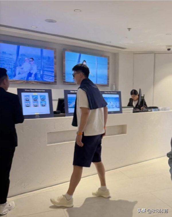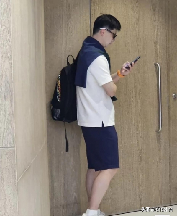 马龙穿着一件白T恤,配上蓝色短裤,主要负责引导两个孩子、调试设备等琐事。