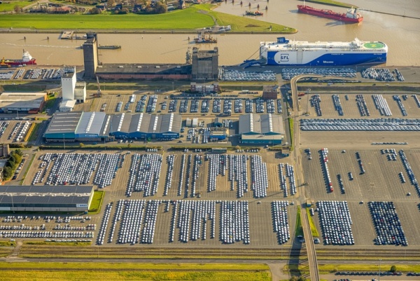 德国下萨克森州埃姆登市,航拍显示大众汽车工厂物流场景:埃姆登外港停泊着SFL沃尔夫斯堡汽车运输船,船上设有绞盘专用装载区,通过缆绳进行车辆装卸作业。 IC Photo